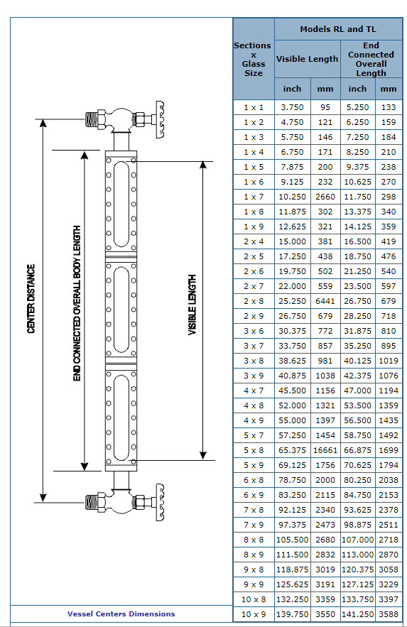 These models are available in Single and Multiple Section type sizes 4 through 9 with a one piece liquid chamber, machined from solid bar stock of cold rolled carbon steel, stress relieved and assembled complete with drop forged steel covers, tempered borosilicate glasses, resistant to thermal shock, heat, corrosion and abrasion; gaskets; bolts and nuts.
