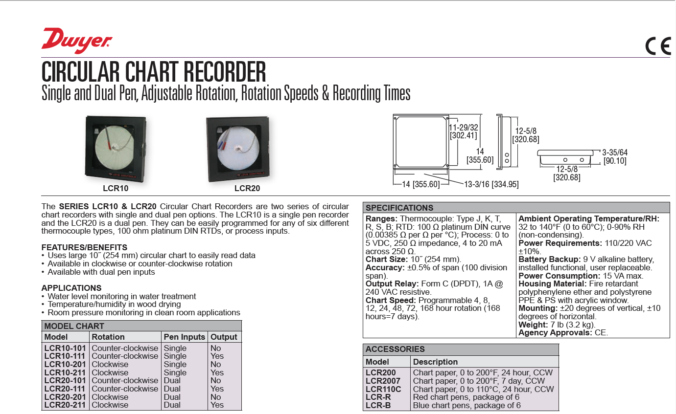 Brand: Dwyer Instruments, LLCThe Series LCR10 Circular Chart Recorders are two series of circular chart recorders with single and dual pen options.