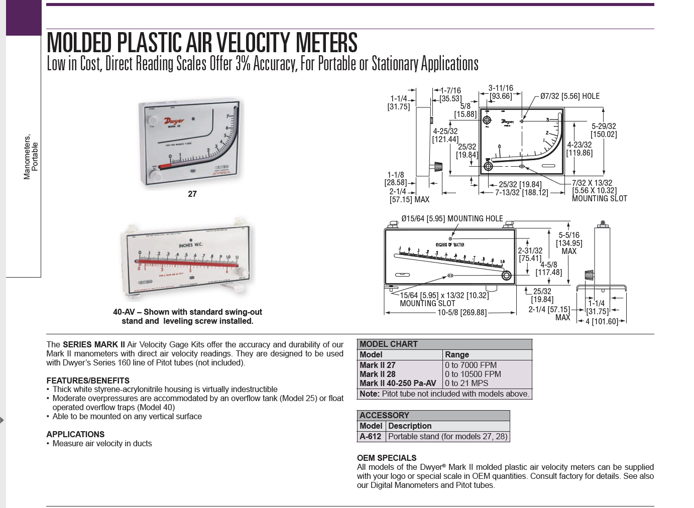 Additional standard accessories include plastic connection tubing, mounting screws, 3/4 oz. bottle of indicating fluid and instructions. Metric ranges are also available.