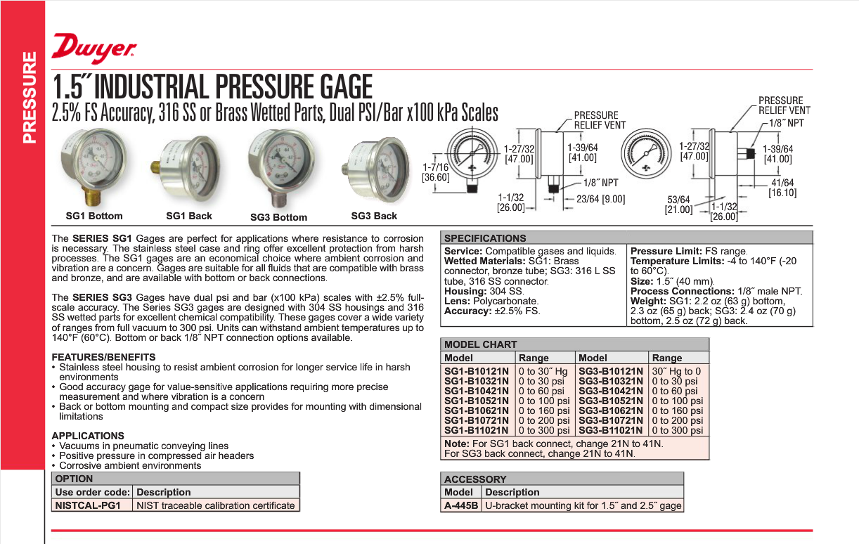 Brand: Dwyer Instruments, LLCThe Series SG1 Industrial Pressure Gauges are perfect for applications where resistance to corrosion is necessary.